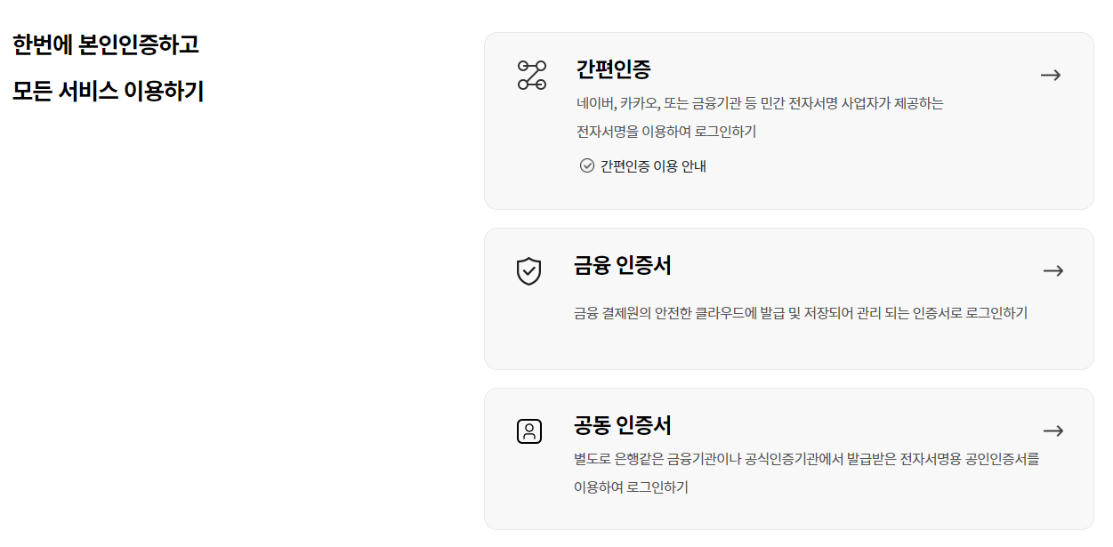 본인인증을 해야하며 간편 인증, 금융인증, 공동인증으로 가능합니다. 간편 인증은 네이버나 카카오톡 같은 금융기관, 민간전자서명 등 평소에 사용하시는 어플로 간단하게 인증이 가능합니다.