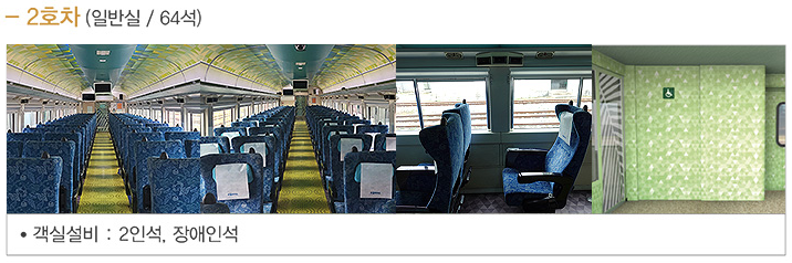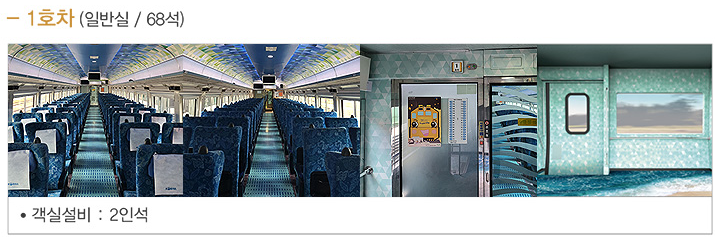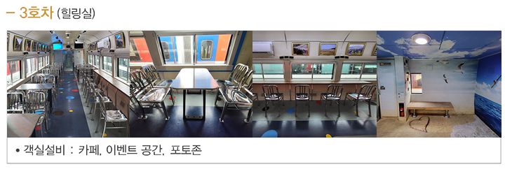 전체 좌석 수 총 254석인 이 열차는 5량으로 구성되어있습니다. 1,2호차는 일반실이며 각각 68석, 64석의 좌석을 갖추고 있습니다. 3호차는 힐링실로 카페나 이벤트공간, 포토존으로 구성되어 있으며, 4호차는 일반실 68석입니다. 마지막 5호차는 온돌마루로 서해금빛열차 온돌 예약은 1 실당 6석으로 구성되어 있으며 총 9실밖에 없어 경쟁이 치열하니 일정을 미리 계획하신 후 빠른 예약을 해주시는 게 유리합니다.