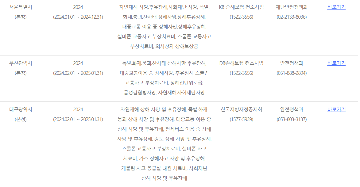 위 사이트를 통하여 내가 거주하고 있는 지역 검색이 가능하며, 보장항목이 자세히 나와 있습니다. 시민안전보험 가입한 지자체는 수많은 지자체에서 운영하고 있지만 꼭 한번 더 확인해 보시기 바랍니다.