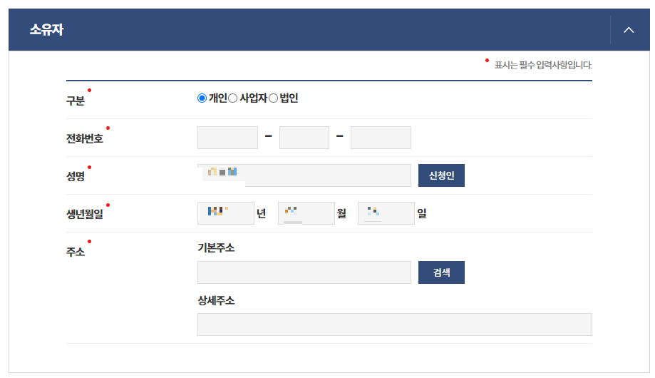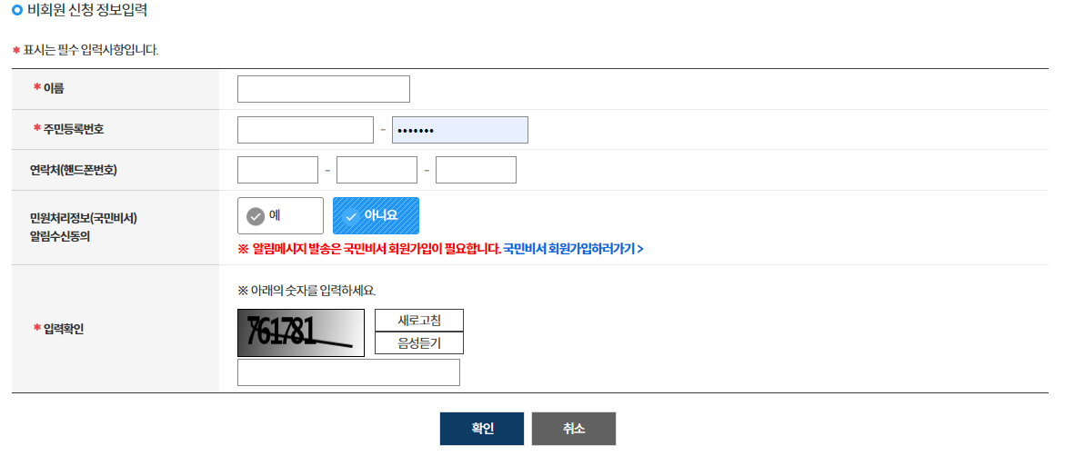 이름, 주민등록번호, 입력확인의 필수 입력 *표시 부분을 입력 후 '확인'을 눌러줍니다. |