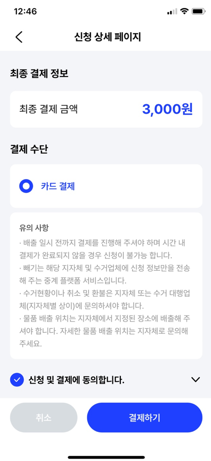 - 취소 및 환불은 지자체 혹은 지자체 계약 수거업체를 통하여 가능합니다.