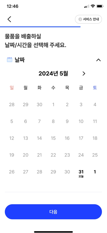 원하는 배출날짜, 시간, 최종확인 후 다음으로 넘어갑니다. |