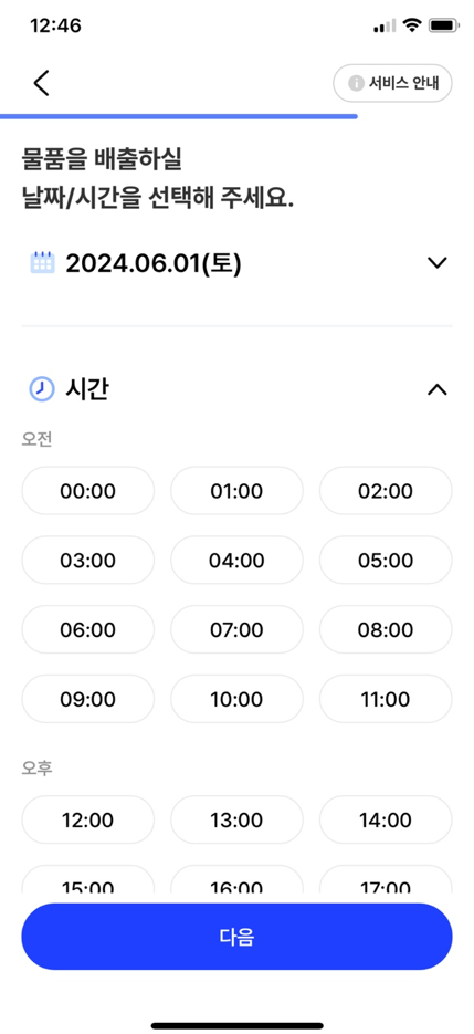 | 원하는 배출날짜, 시간, 최종확인 후 다음으로 넘어갑니다. |
